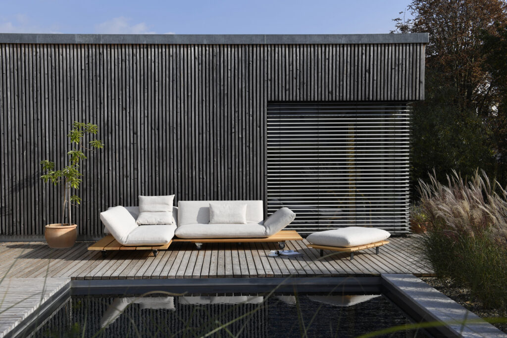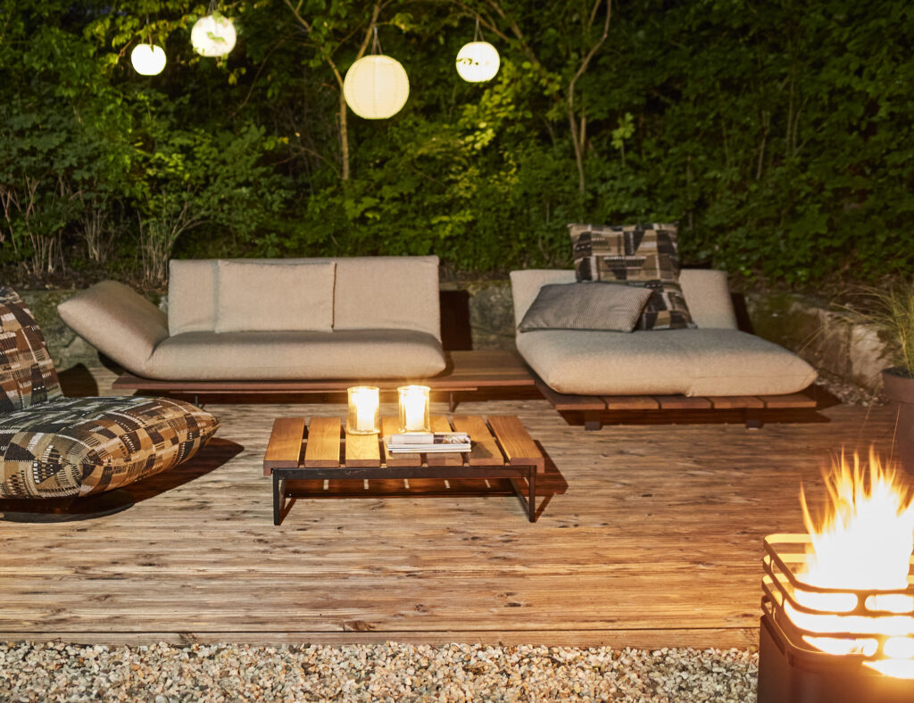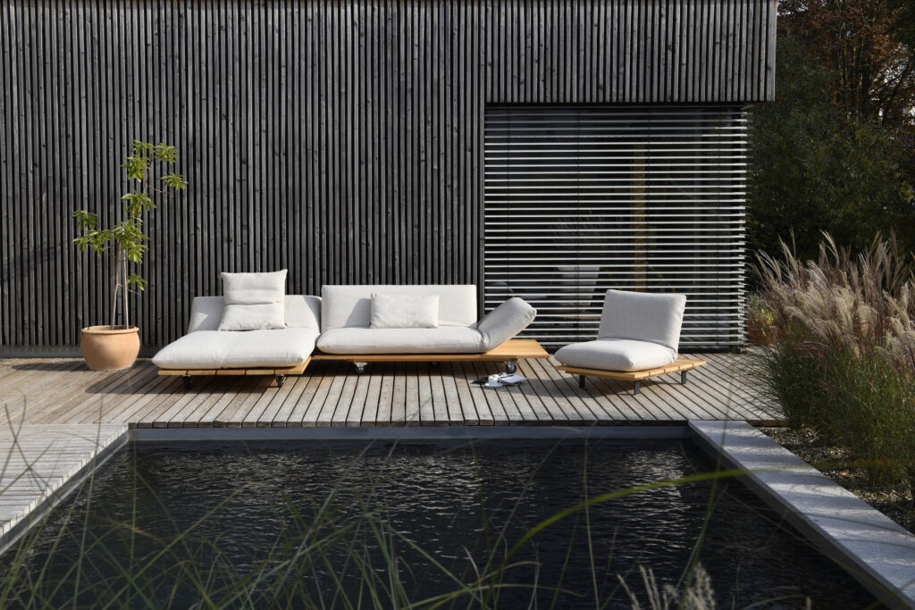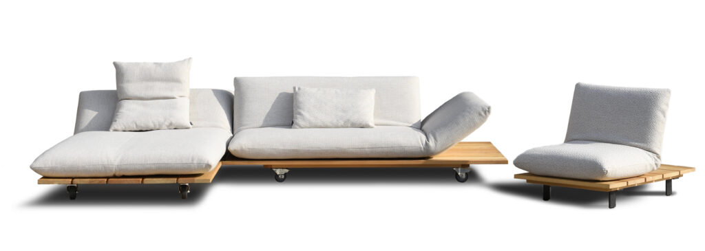 DIE LEICHTIGKEIT DES SEINS. LEICHTE, KLARE LINIE MIT VARIABLEN FUNKTIONEN. ELEMENTE MANUELL UM 40 cm VERSCHIEBBAR. AUSSERGEWÖHNLICHE ÄSTHETIK, GEPRÄGT DURCH EIN MASSIVHOLZPLATEAU. INDIVIDUELLE TYP- UND NAHTAUSFÜHRUNGEN. HOLZARTEN UND OUTDOORSTOFFE WÄHLBAR. DAZU PASSEND: WIND- UND REGENFESTE ABDECKHÜLLE. AUCH ALS INDOOR VARIANTE ERHÄLTLICH.