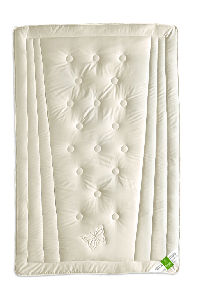 ist eine Bio-Decke mit einem Bezug aus 100% Baumwollsatin aus kontrolliert biologischem Anbau und mit einer Füllung aus 100% Seide. (Eri Seide)