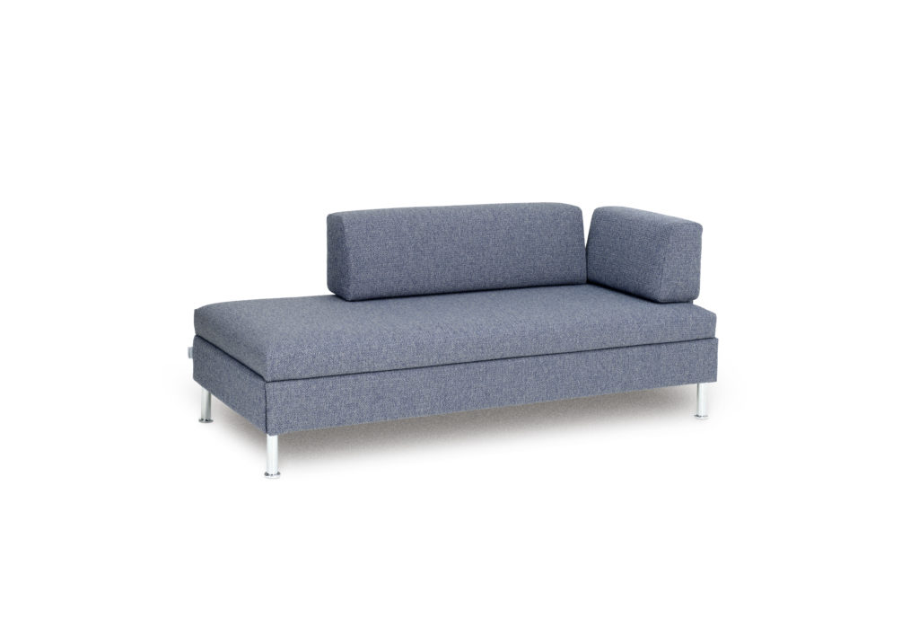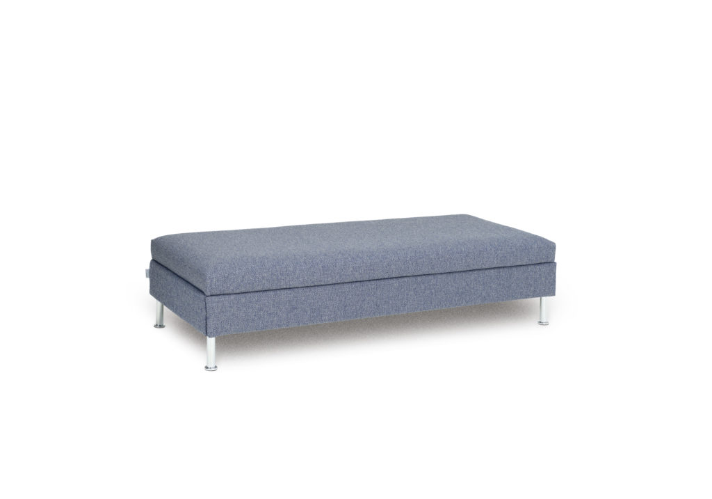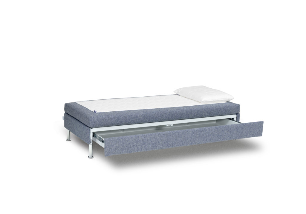 Auf den ersten Blick sieht das Bed for living SINGOLO aus wie das DOPPIO. Der Unterschied zeigt sich beim näheren Hinschauen: Statt des zweiten Lattenrosts versteckt sich unter der Sitzfläche – beziehungsweise unter der Matratze – ein geräumiger, ausziehbarer Metallbettkasten mit 10x70x176cm grossem Stauraum für Leintücher, Duvet und Kopfkissen.