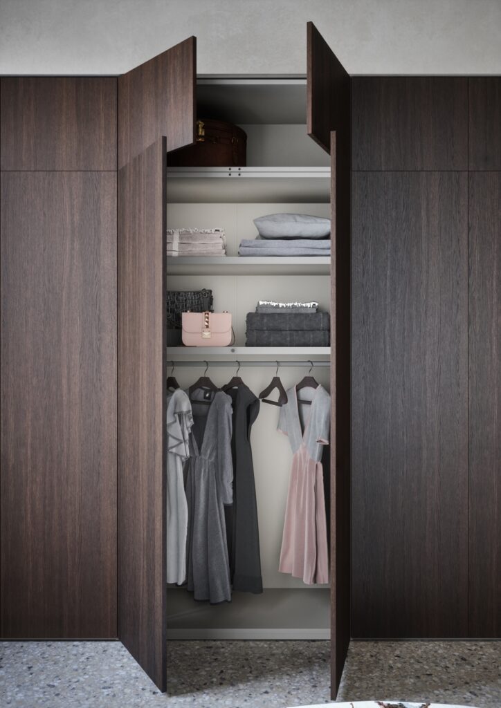Der Schrank mit Flügeltüren Alfa erlaubt die Entwicklung individueller Raumlösungen und erfüllt nahezu alle vom persönlichen Geschmack und den räumlichen Erfordernissen bestimmten Ansprüche – als Einbauschrank sowie als Wand- oder Ecklösung. Wie alle Schränke mit Flügeltüren kann auch er mit Glasseitenwänden und innen mit einer Trennwand mit Metallrahmen geplant werden. Auf Wunsch auch mit LED-Beleuchtung.