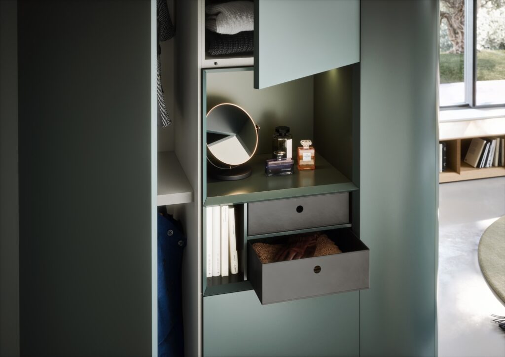 In verschiedenen Ausführungen. Mit Tip-on-Beschlag oder unterschiedlichen Griffmodellen. In der Variante Intono wird der Schrank in der Farbe der Wände lackiert.